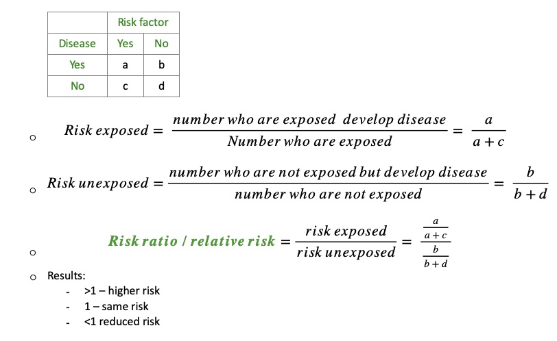 - Risk ratio indicates increased/decreased risk of disease associated with factor of interest