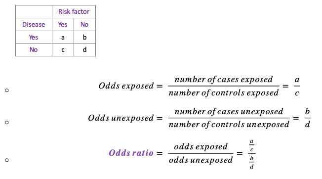 - Odds ratio indicates the odds of disease in individuals exposed and unexposed to a factor